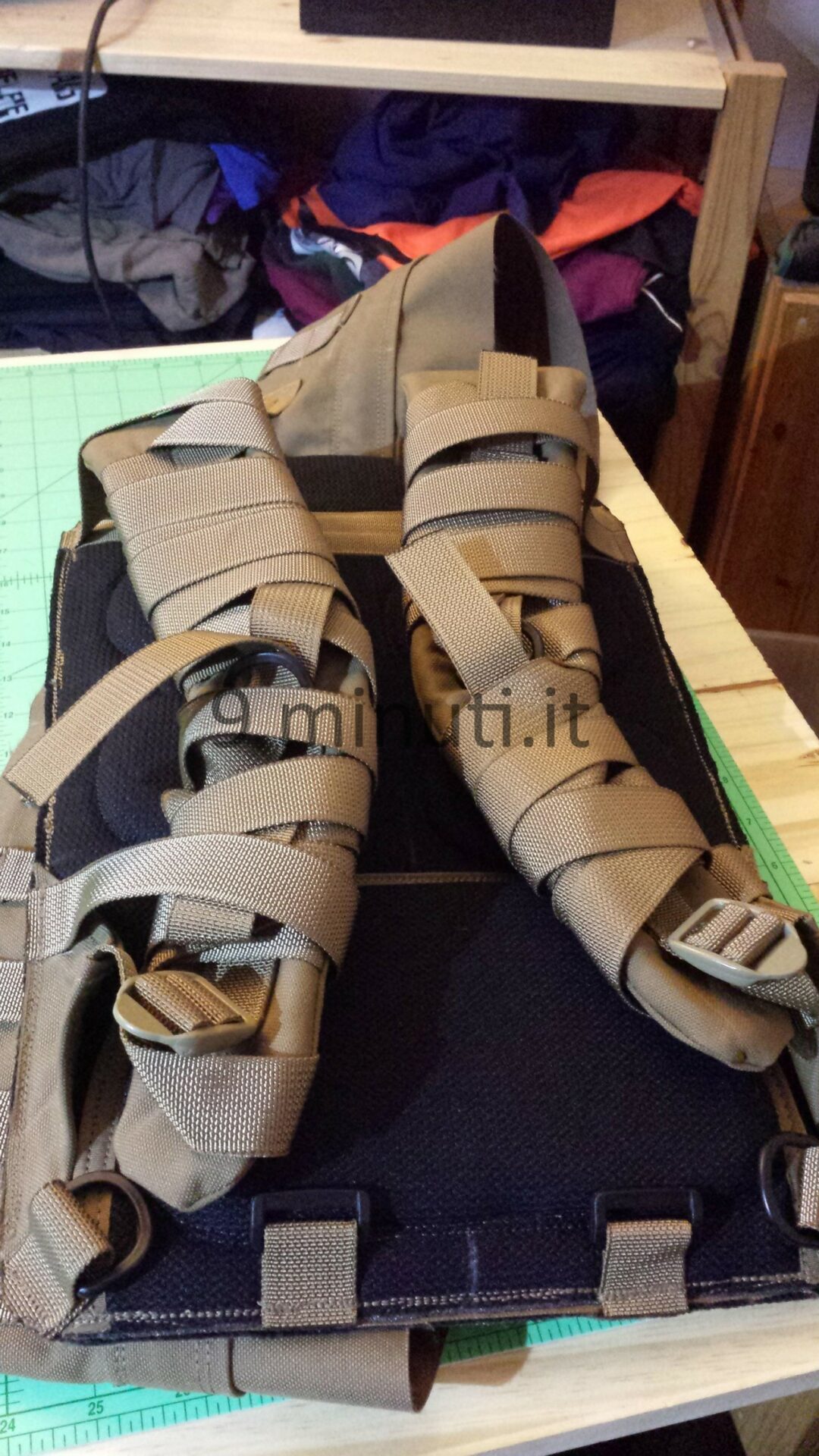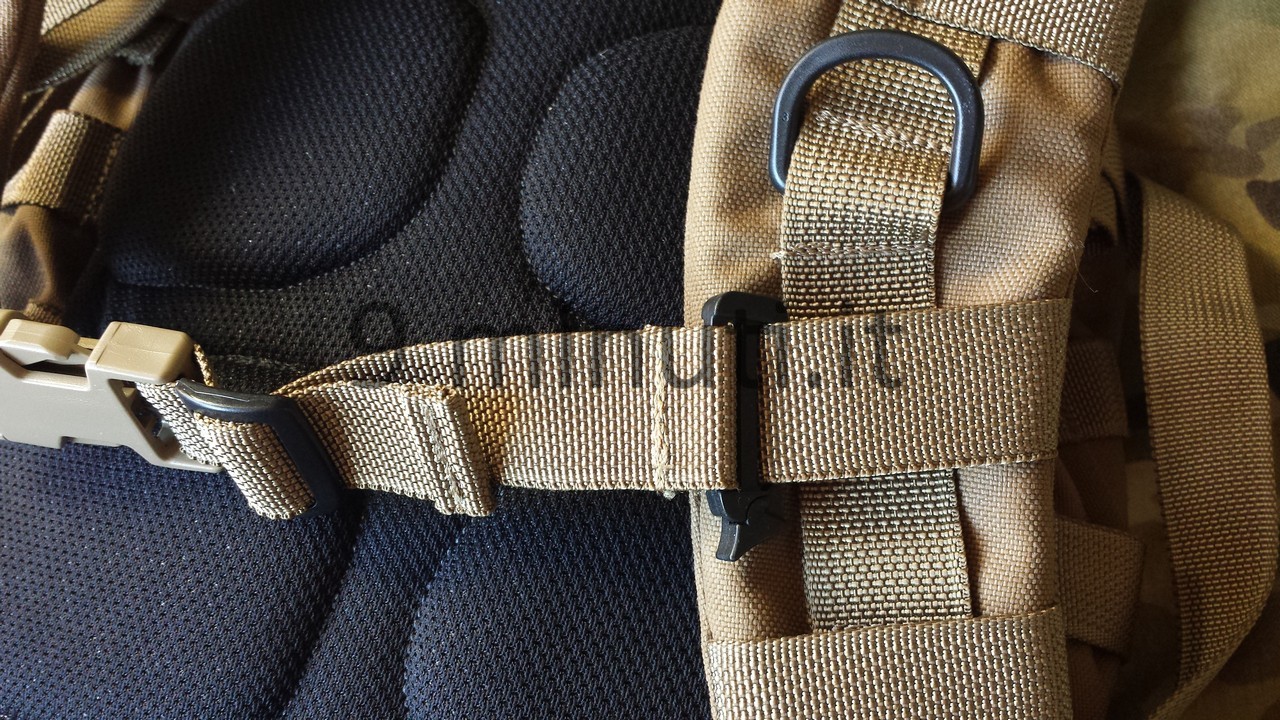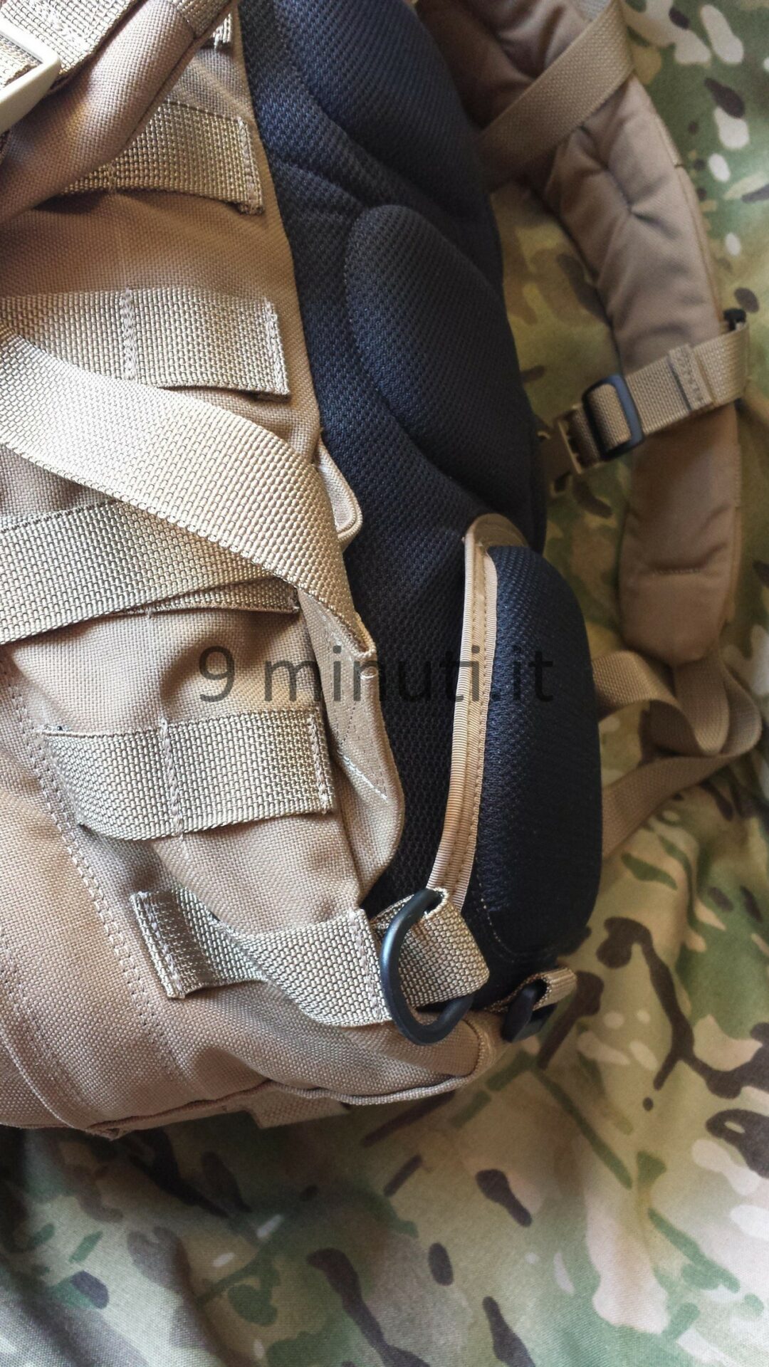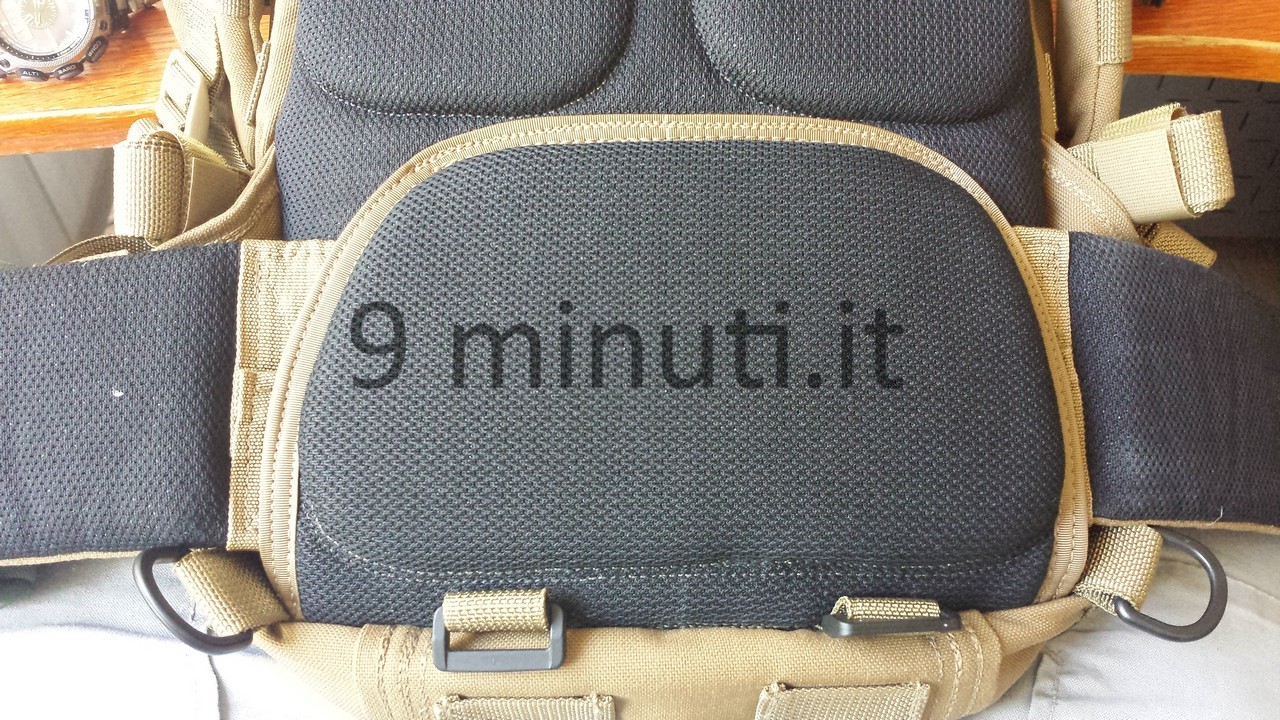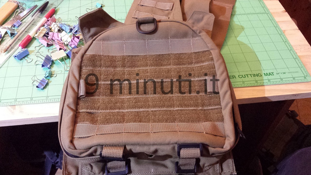Lo zaino è pensato per poter contenere il materiale sufficiente per quarantotto ore, quindi cibo, acqua, vestiari e accessori vari. La stoffa è la sempreverde Cordura 1000d, questa volta non ho foderato internamente risparmiando parecchio in termini di peso. Già così lo zaino ha un peso notevole ma trasmette appieno la propria solidità. Esternamente ho voluto mettere quanti più pals possibili in modo da renderlo estremamente modulare e versatile, tant’è che aggiungendo altre tasche (purtroppo non ho le foto) acquisisce una capacità di carico ben maggiore. Per lo schienale ho applicato la stessa tecnica tridimensionale provata in precedenza con il piccolo M.A.P. , e che però non mi aveva entusiasmato dal punto di vista estetico. Ho scelto di installare quelle quattro ‘saponette’ in modo da lasciare una fessura lungo la colonna vertebrale e al contempo orizzontalmente vi è più passaggio d’aria. Gli spallacci sono imbottiti e hanno anch’essi dei pals per potervi montare una piccola tasca porta coltello, radio, etc.