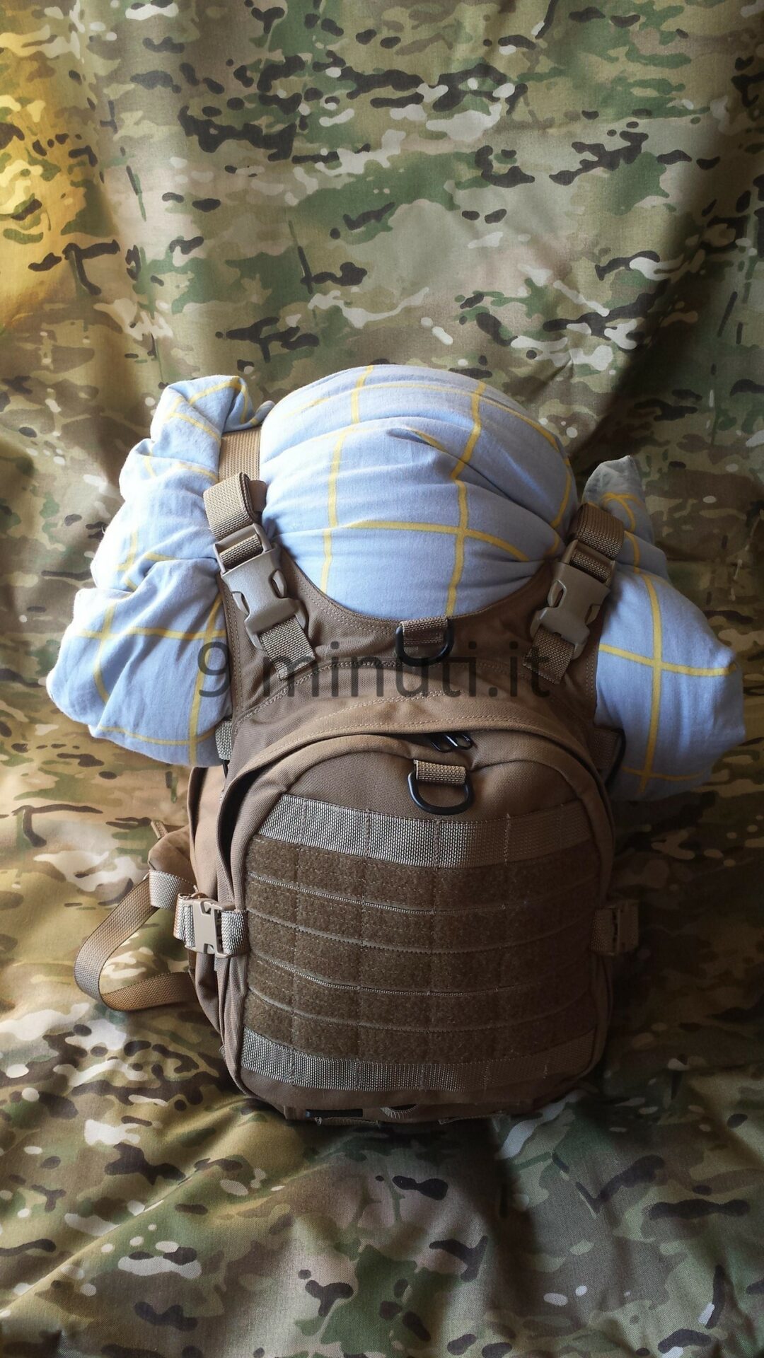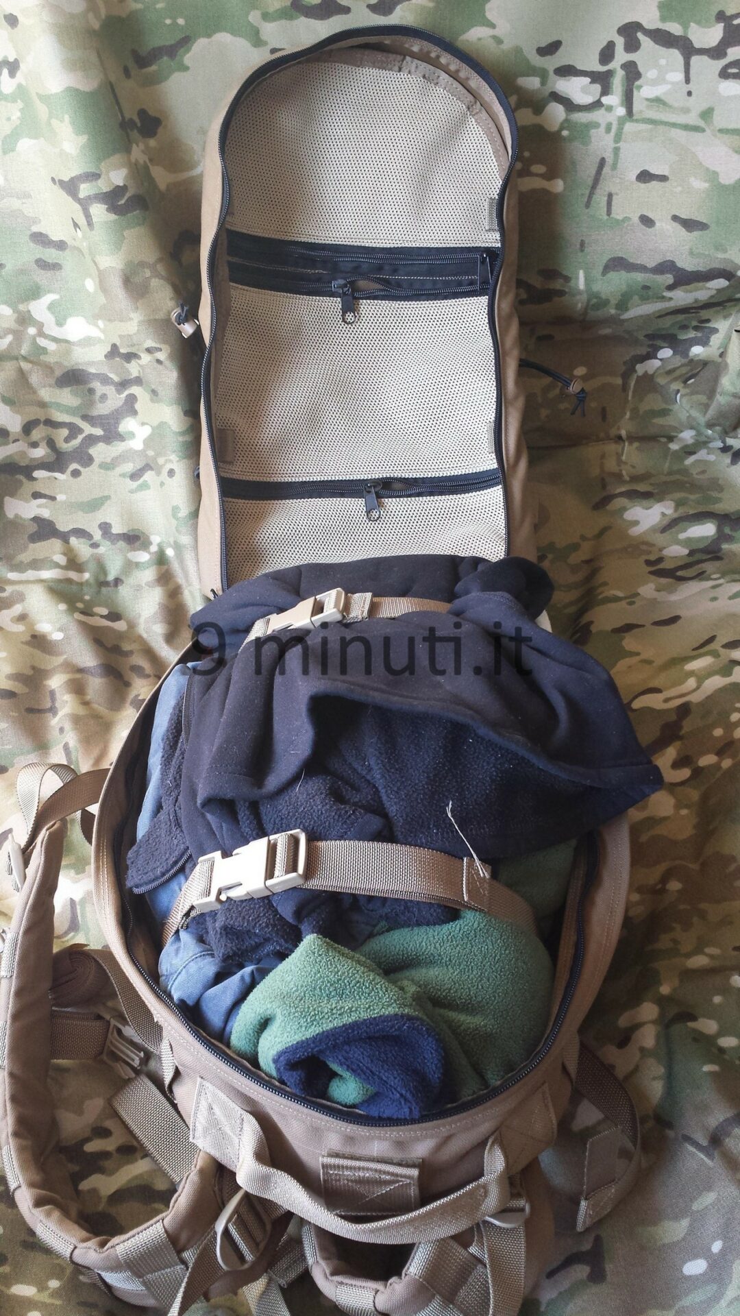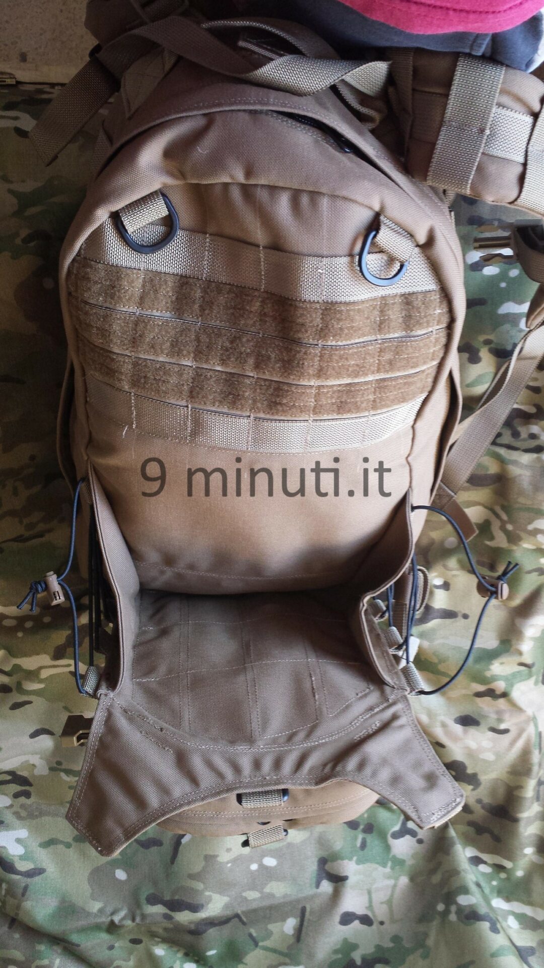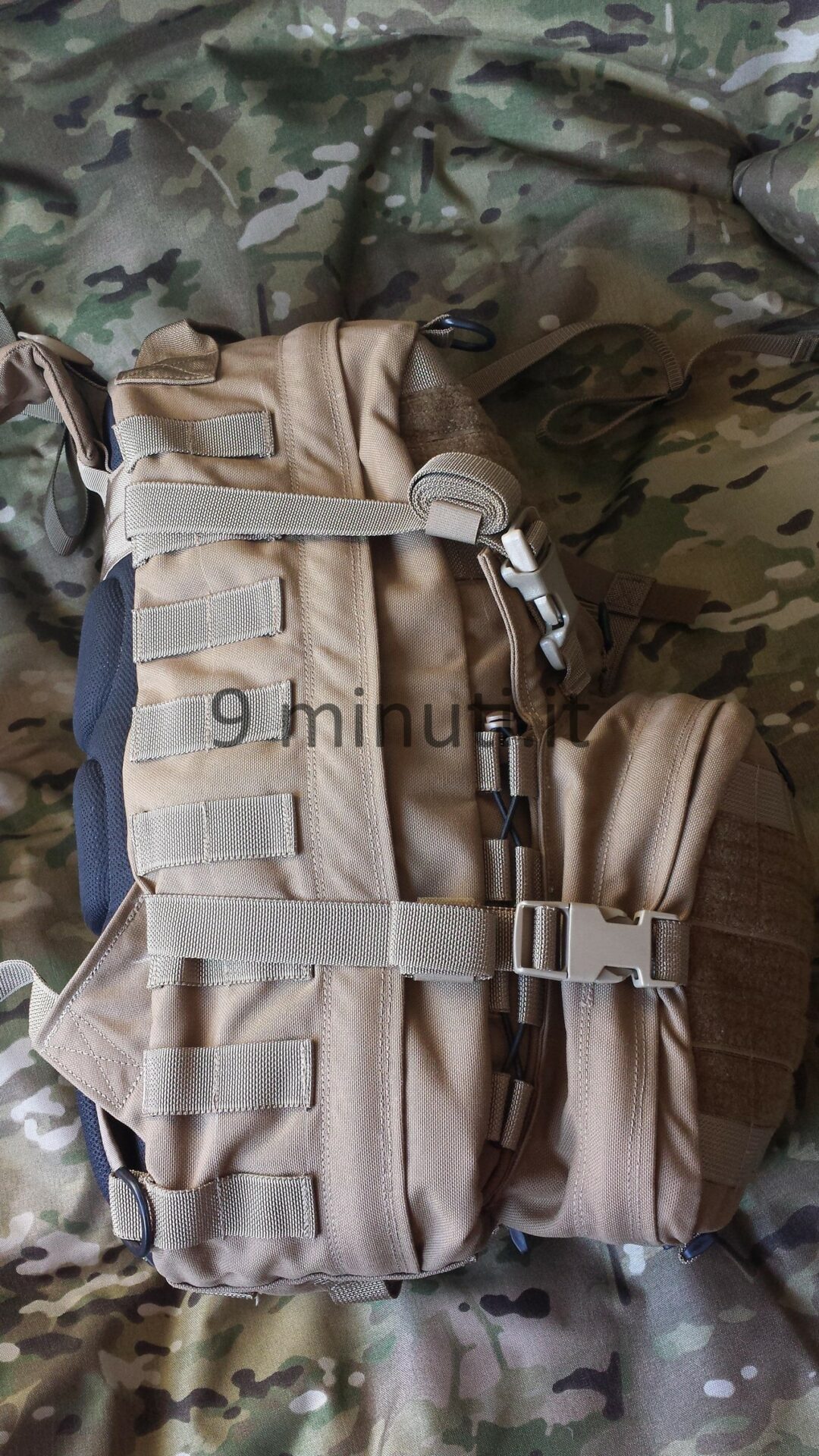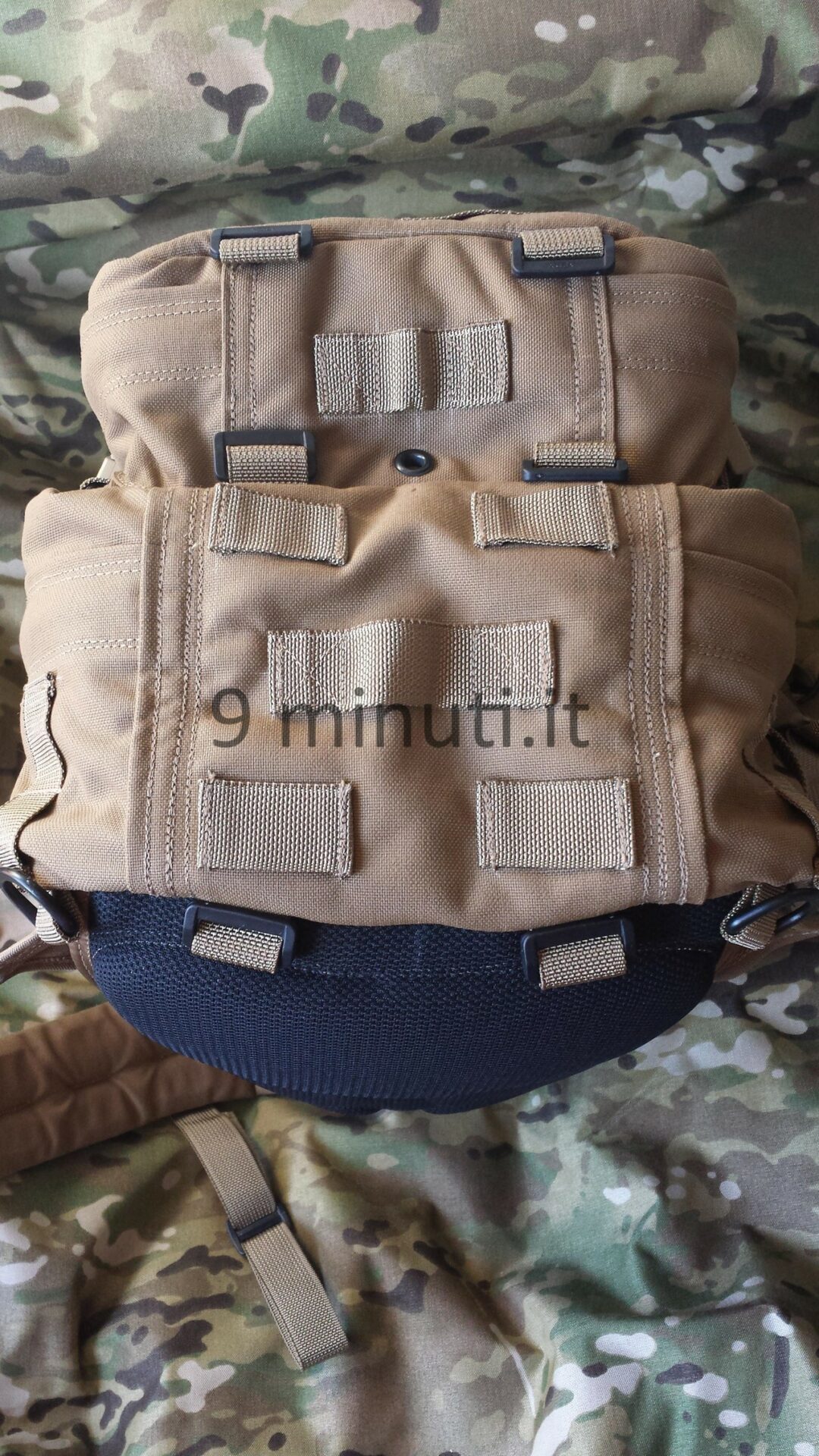 Lo zaino è pensato per poter contenere il materiale sufficiente per quarantotto ore, quindi cibo, acqua, vestiari e accessori vari. La stoffa è la sempreverde Cordura 1000d, questa volta non ho foderato internamente risparmiando parecchio in termini di peso. Già così lo zaino ha un peso notevole ma trasmette appieno la propria solidità. Esternamente ho voluto mettere quanti più pals possibili in modo da renderlo estremamente modulare e versatile, tant’è che aggiungendo altre tasche (purtroppo non ho le foto) acquisisce una capacità di carico ben maggiore. Per lo schienale ho applicato la stessa tecnica tridimensionale provata in precedenza con il piccolo M.A.P. , e che però non mi aveva entusiasmato dal punto di vista estetico. Ho scelto di installare quelle quattro ‘saponette’ in modo da lasciare una fessura lungo la colonna vertebrale e al contempo orizzontalmente vi è più passaggio d’aria. Gli spallacci sono imbottiti e hanno anch’essi dei pals per potervi montare una piccola tasca porta coltello, radio, etc.