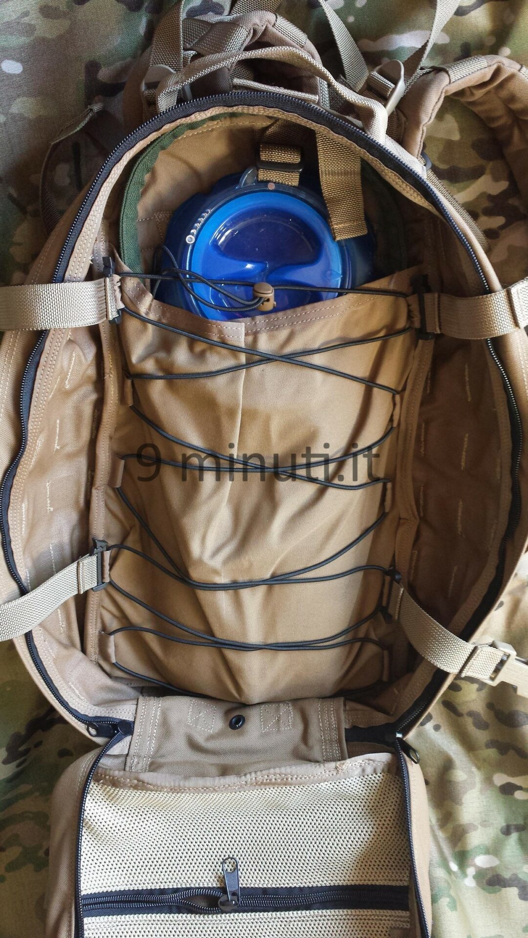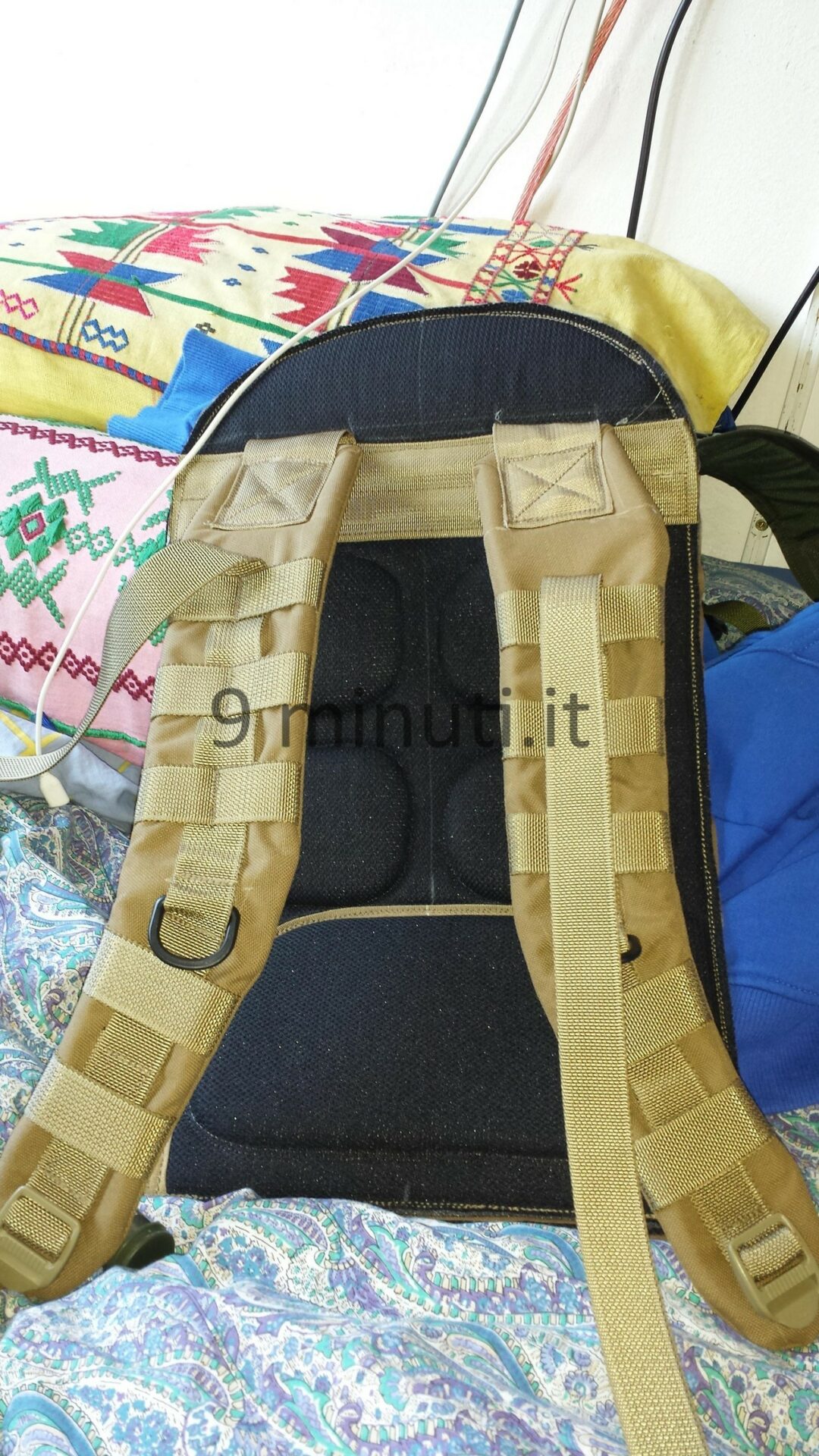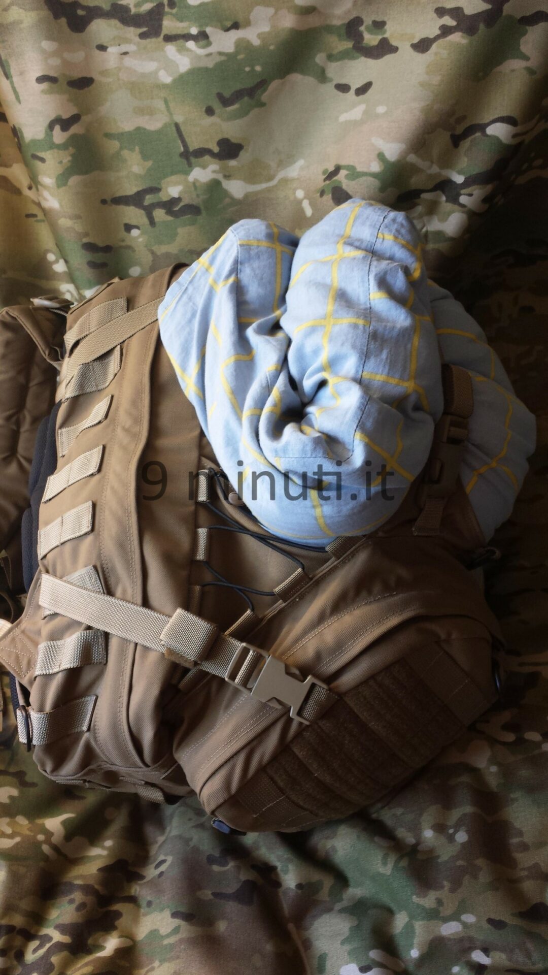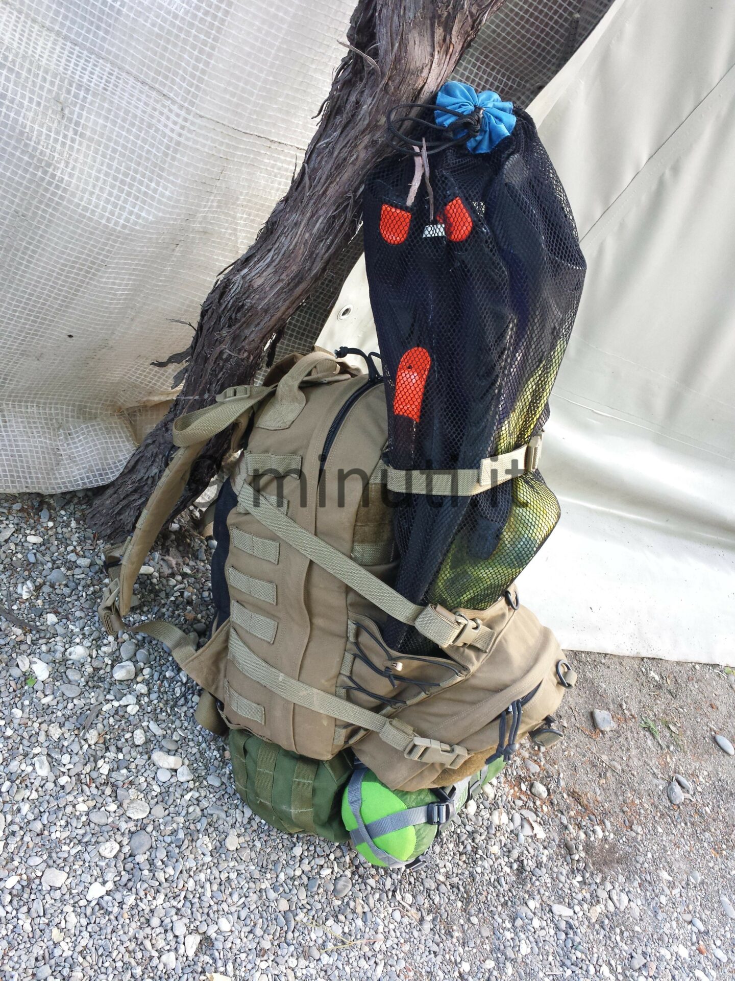Lo zaino è pensato per poter contenere il materiale sufficiente per quarantotto ore, quindi cibo, acqua, vestiari e accessori vari. La stoffa è la sempreverde Cordura 1000d, questa volta non ho foderato internamente risparmiando parecchio in termini di peso. Già così lo zaino ha un peso notevole ma trasmette appieno la propria solidità. Esternamente ho voluto mettere quanti più pals possibili in modo da renderlo estremamente modulare e versatile, tant’è che aggiungendo altre tasche (purtroppo non ho le foto) acquisisce una capacità di carico ben maggiore. Per lo schienale ho applicato la stessa tecnica tridimensionale provata in precedenza con il piccolo M.A.P. , e che però non mi aveva entusiasmato dal punto di vista estetico. Ho scelto di installare quelle quattro ‘saponette’ in modo da lasciare una fessura lungo la colonna vertebrale e al contempo orizzontalmente vi è più passaggio d’aria. Gli spallacci sono imbottiti e hanno anch’essi dei pals per potervi montare una piccola tasca porta coltello, radio, etc.
